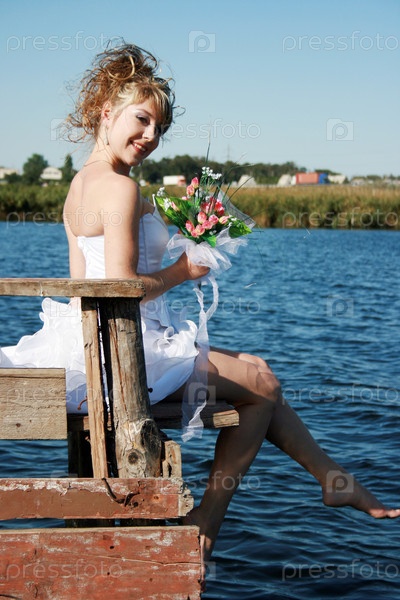 Красивая улыбающаяся невеста сидит на маленьком мосту возле реки