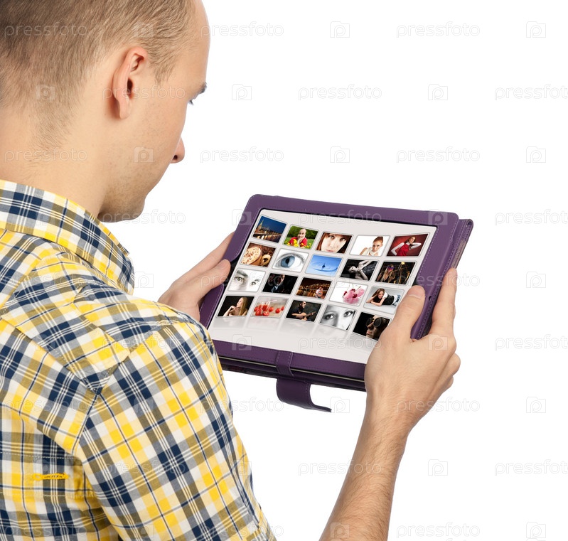Молодой мужчина с планшетным компьютером на белом фоне
