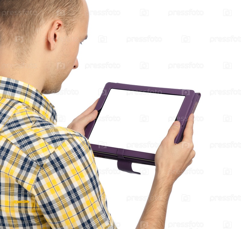Молодой мужчина с планшетным компьютером на белом фоне