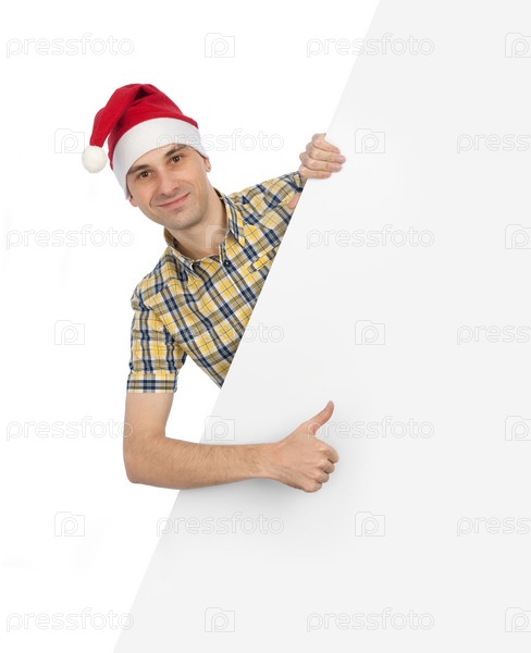 Молодой мужчина в шапке Санта-Клауса на белом фоне