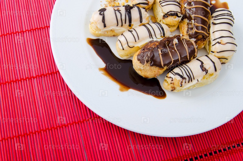 Пирожные с шоколадным соусом в тарелке