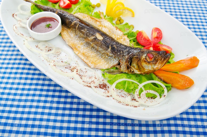Жареная рыба с овощами на белой тарелке