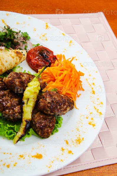 Шашлык и овощи сервированы на белой тарелке