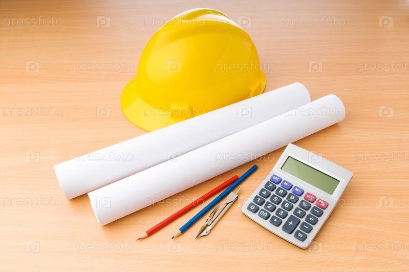 Чертежи,калькулятор и каска лежат на столе