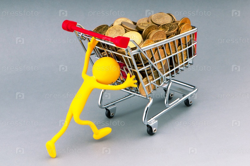 Пластиковый человечек везет тележку, наполненную монетами