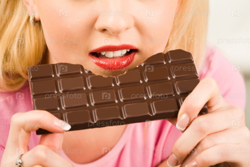 Близкий план женщины, держащей молочный шоколад и съедающей его