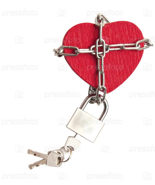 Сердце, обмотанное цепями с замком и ключами, на белом фоне