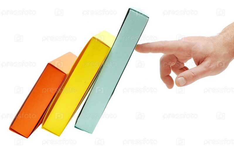 Рука удерживает от падения цветные коробки, на белом фоне