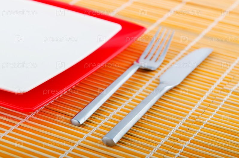Тарелки, вилка и нож на столе