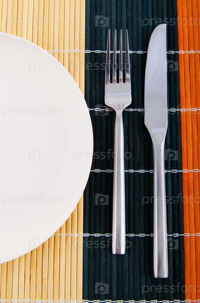 Тарелка, вилка и нож на столе