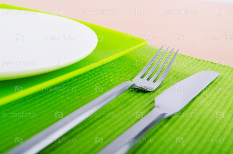 Тарелка, вилка и нож на столе