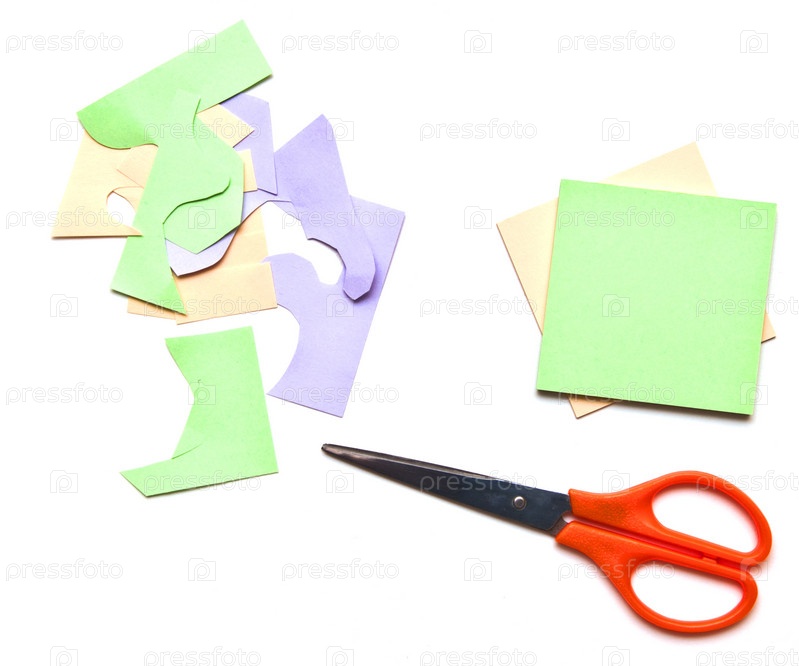 Разрезанные стикеры и ножницы на белом фоне
