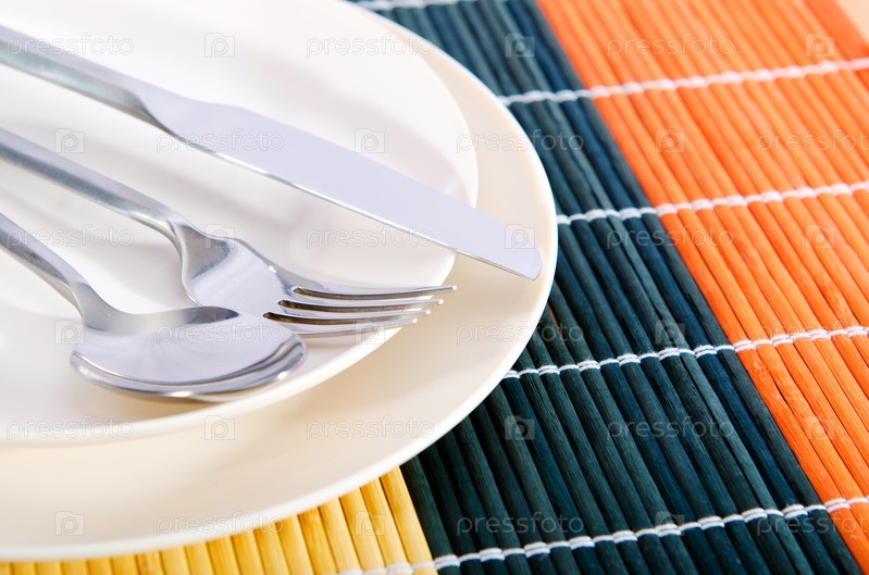 Тарелки с вилкой, ложкой и ножом на столе