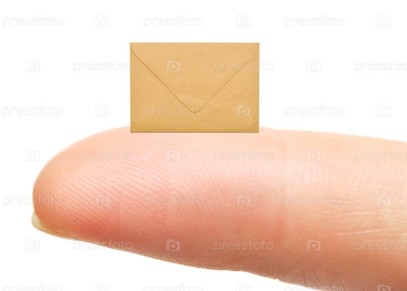 Небольшой конверт на пальце, на белом фоне