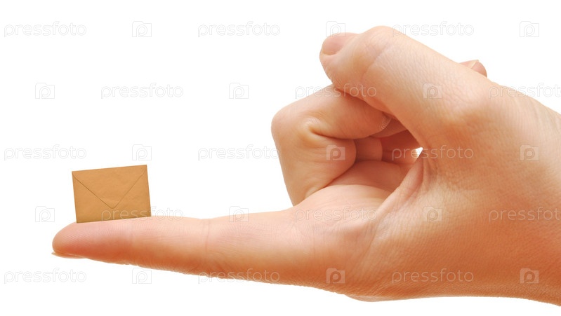 Небольшой конверт на пальце, на белом фоне