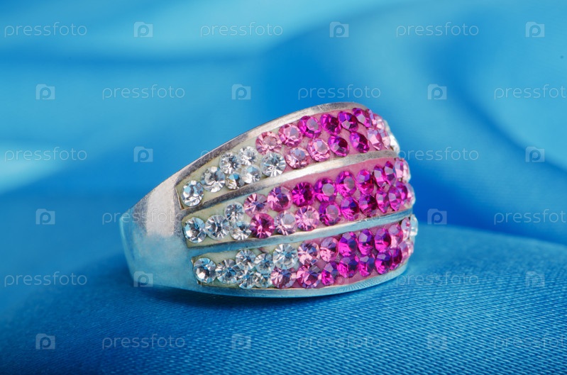 Кольцо с драгоценными камнями на фоне атласной ткани