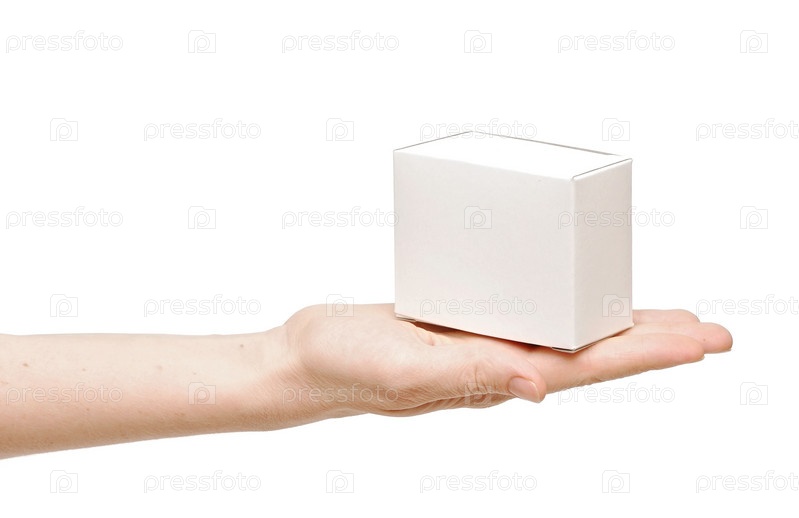 Белая коробка в руках на белом фоне