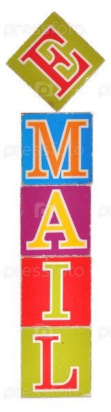 Слово 'e-mail' из цветных кубиков, выделенных на белом фоне