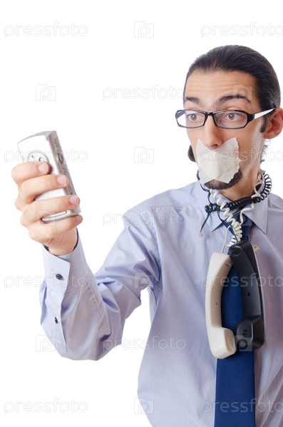 Мужчина с заклеенным ртом, телефонными трубками на шее держит сотовый телефон в руке