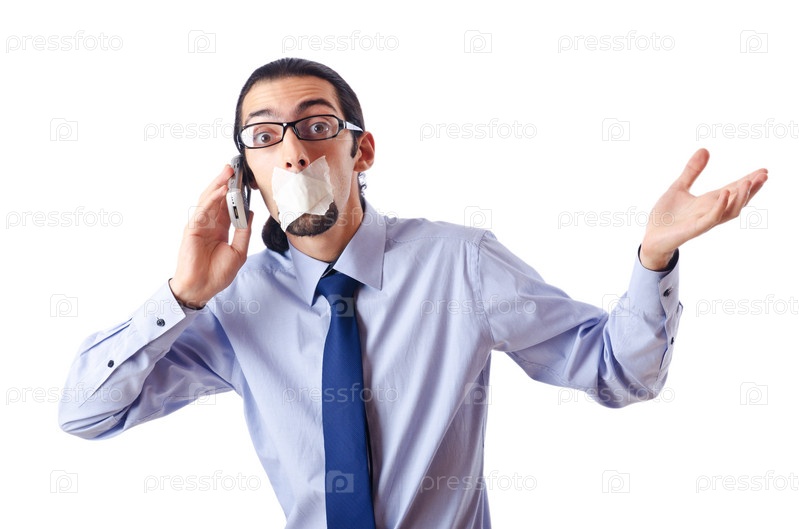Мужчина с заклеенным ртом держит сотовый телефон в руке