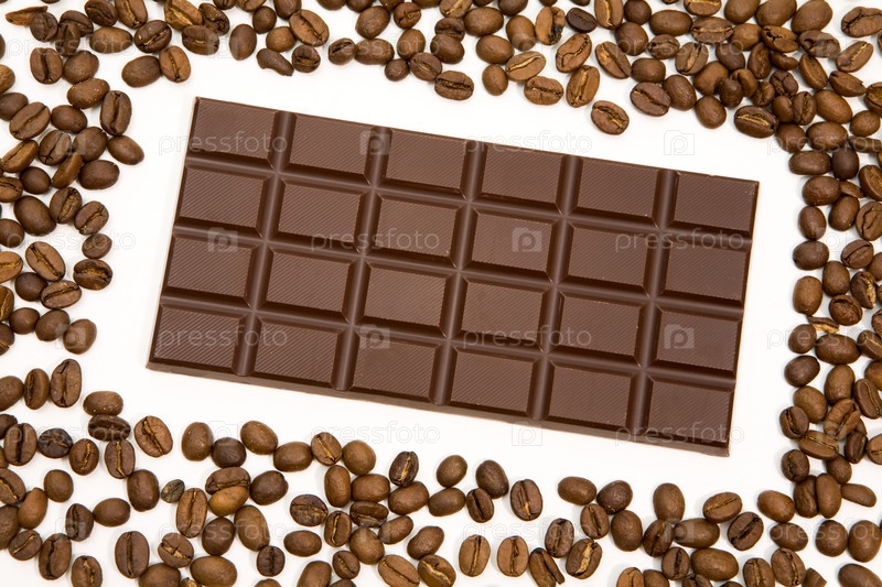 Творческое изображение темного шоколада, окруженного рассеянными зернами кофе