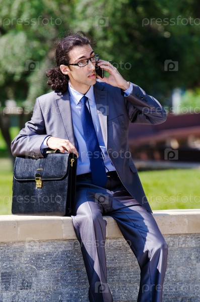 Бизнесмен с портфелем сидит на парапете на открытом воздухе и разговаривает по мобильному телефону