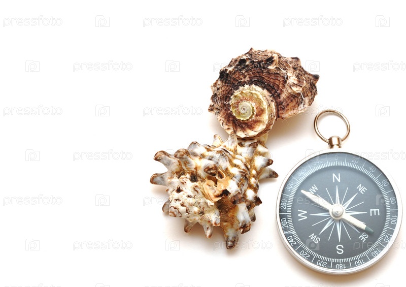 Морские ракушки и компас на белом фоне