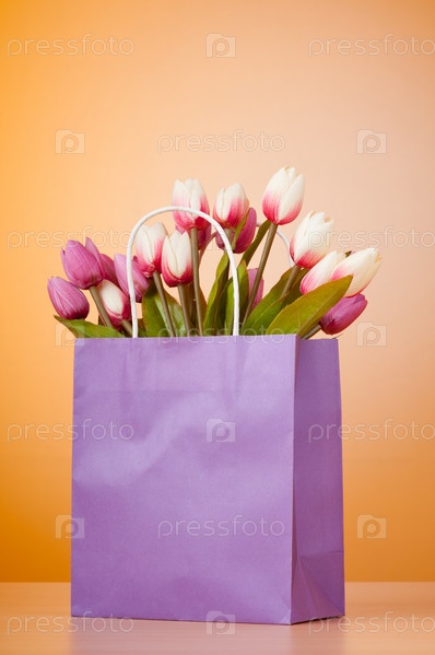 Тюльпаны в бумажном пакете на на градиентном фоне