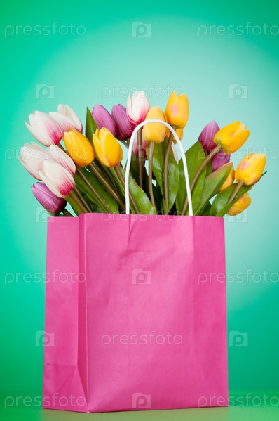 Тюльпаны в бумажном пакете на на градиентном фоне