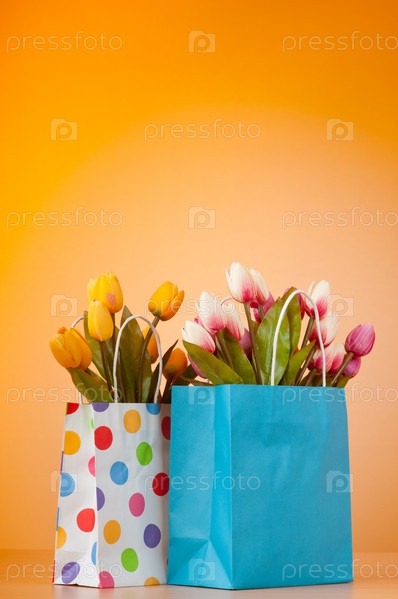 Тюльпаны в бумажном пакете на на градиентном фоне
