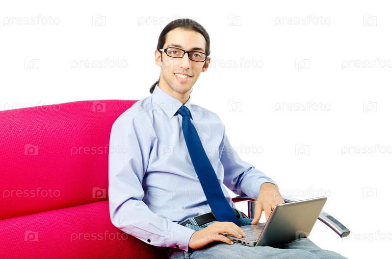 Студент с ноутбуком сидит на диване