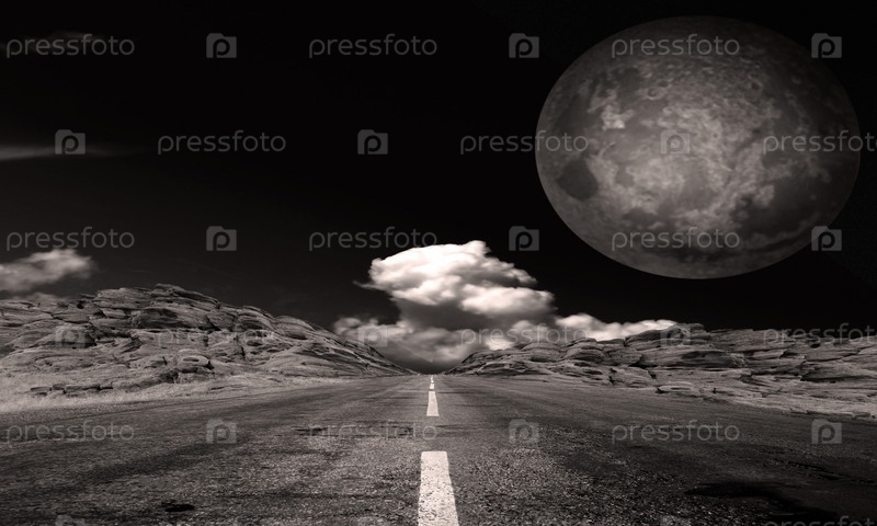 Дорога, идущая вдаль, в темноте, на фоне облака и огромной луны