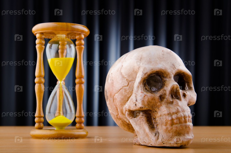 Череп с песочными часами на столе на фоне синего занавеса