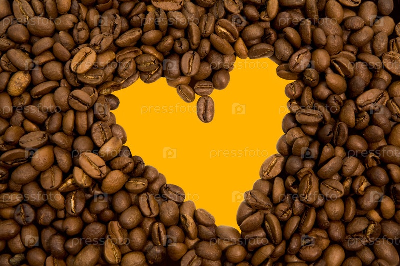 На фоне желтого сердца внутри кофейных зерен