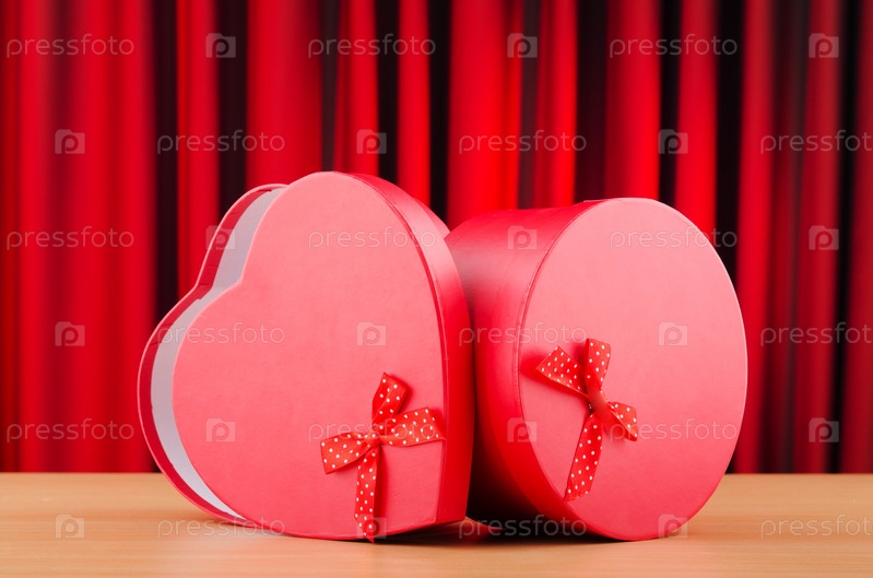Две подарочные коробки на фоне красного занавеса
