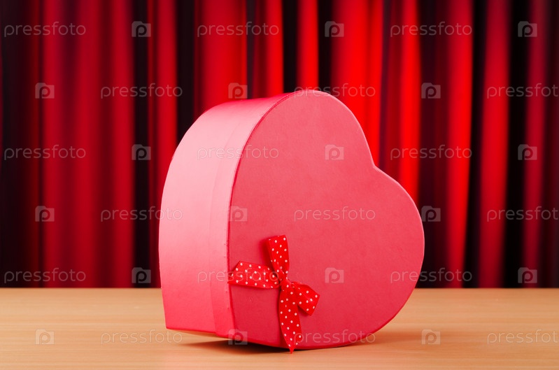 Подарочная коробка на фоне красного занавеса