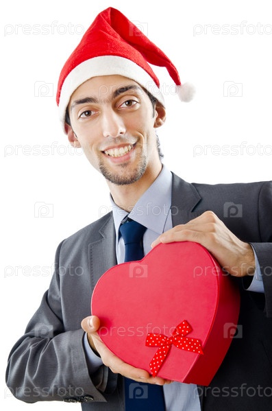 Молодой мужчина-бизнесмен в шапке Санта-Клауса рождественским подарком в руках на белом фоне