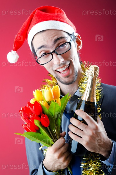Молодой мужчина-бизнесмен в шапке Санта-Клауса на красном фоне