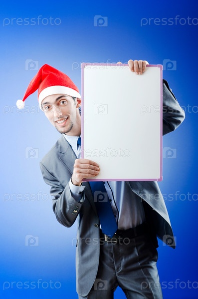 Молодой мужчина-бизнесмен в шапке Санта-Клауса на синем фоне