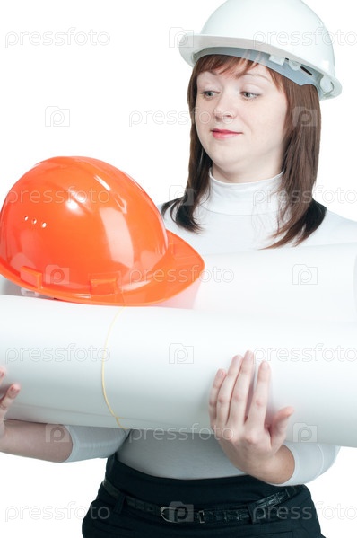 Озадаченная женщина-архитектор с чертежами и строительной каской в руках, изолированная на белом фоне