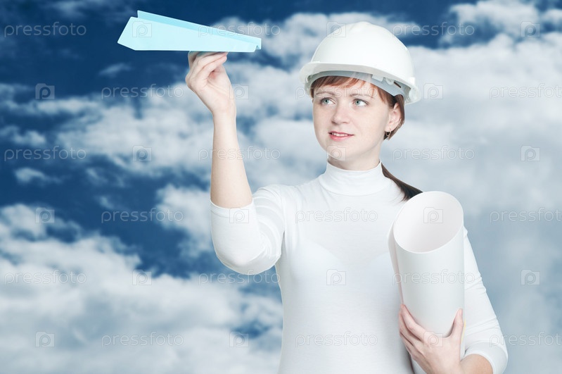 Молодая женщина-инженер с бумажным самолетиком и чертежами в руках. Концепция авиационной промышленности