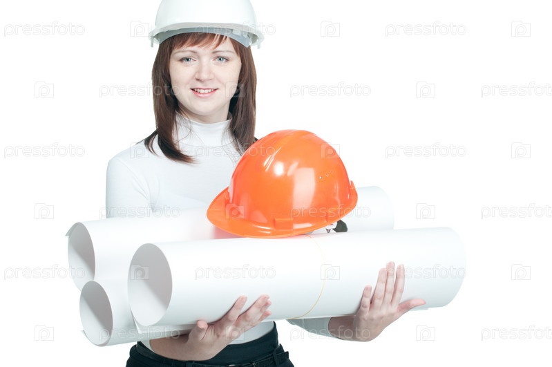 Молодая женщина-инженер, держащая в руках чертежи и строительную каску, белый фон