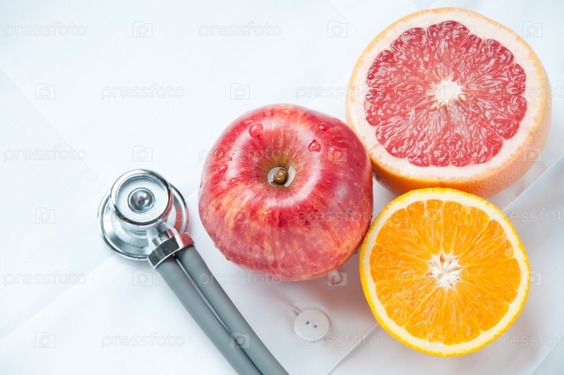 Свежие фрукты и фонендоскоп на медицинском халате