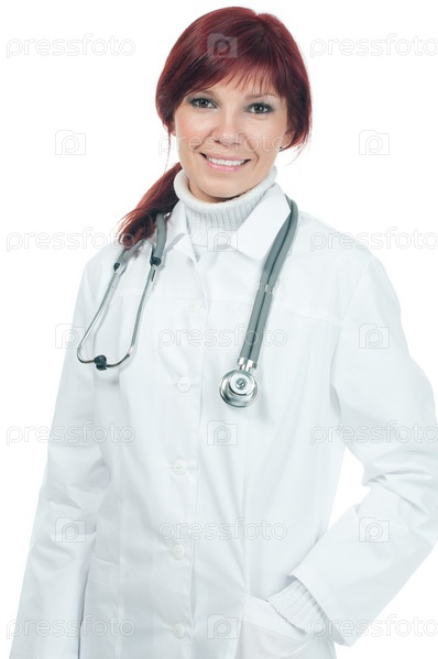 Молодая улыбающаяся женщина-врач в медицинском халате со стетоскопом, белый фон
