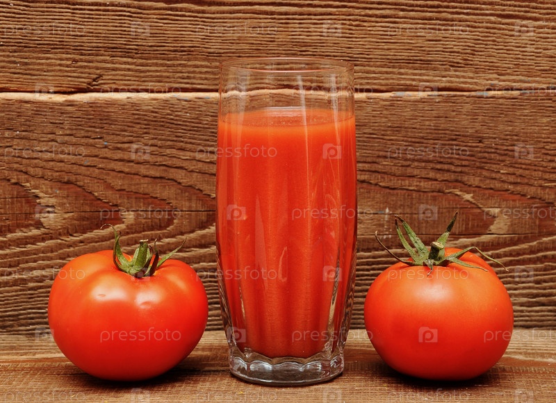 Помидоры и стакан томатного сока на деревянном фоне