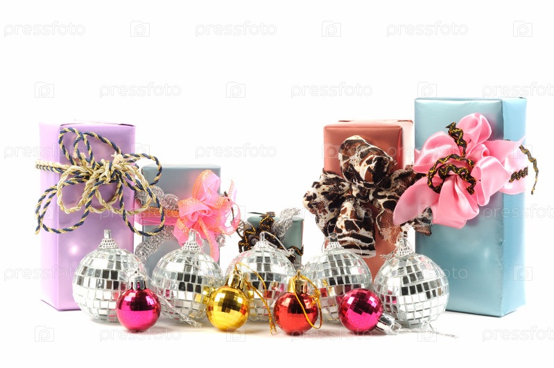 Новогодние подарки и елочные шары на белом фоне