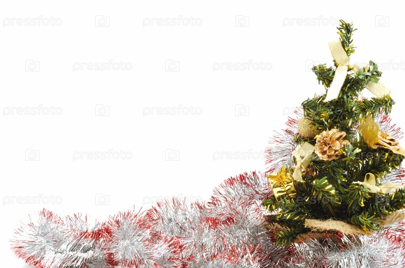 Украшенная елка и мишура на белом фоне