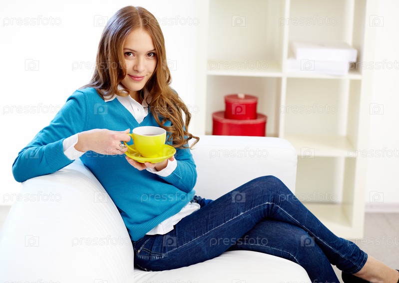 Симпатичная девушка с чашкой чая сидит на диване