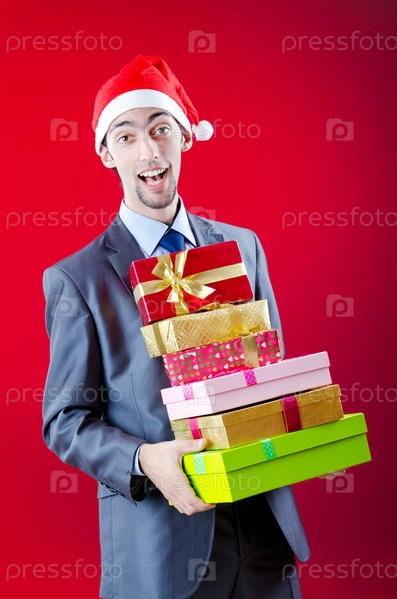 Счастливый бизнесмен держит в руках подарки на красном фоне