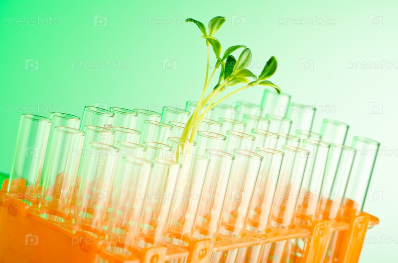 Зеленые саженцы в стеклянных пробирках в лаборатории